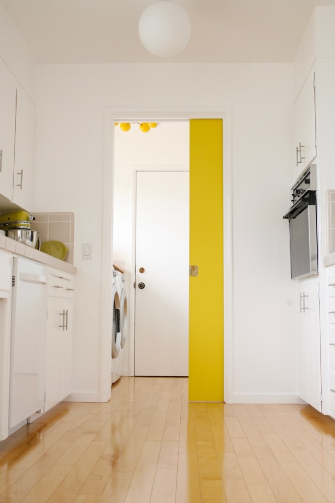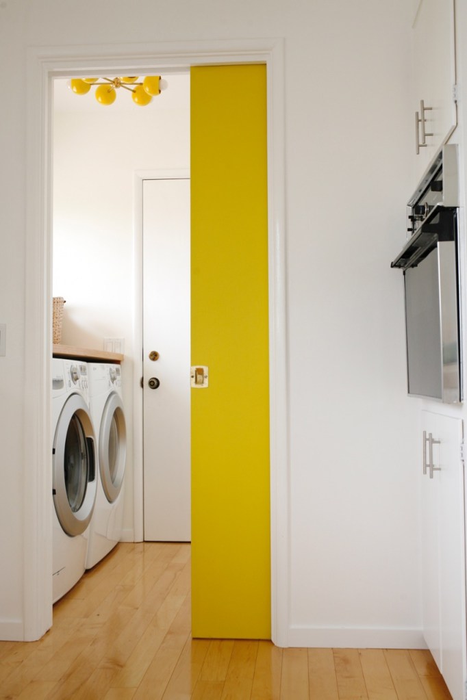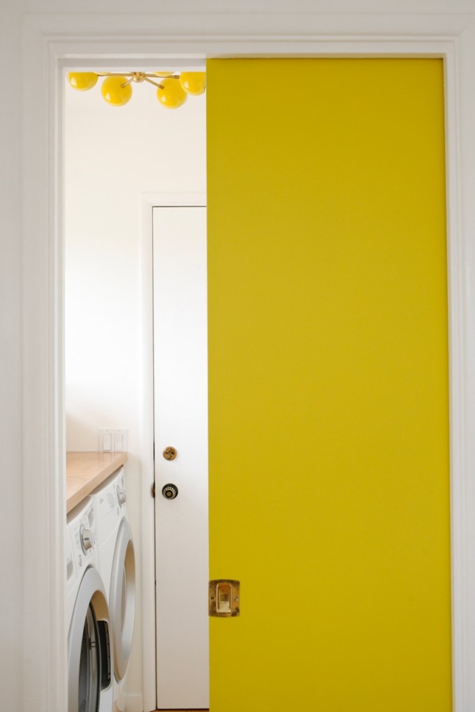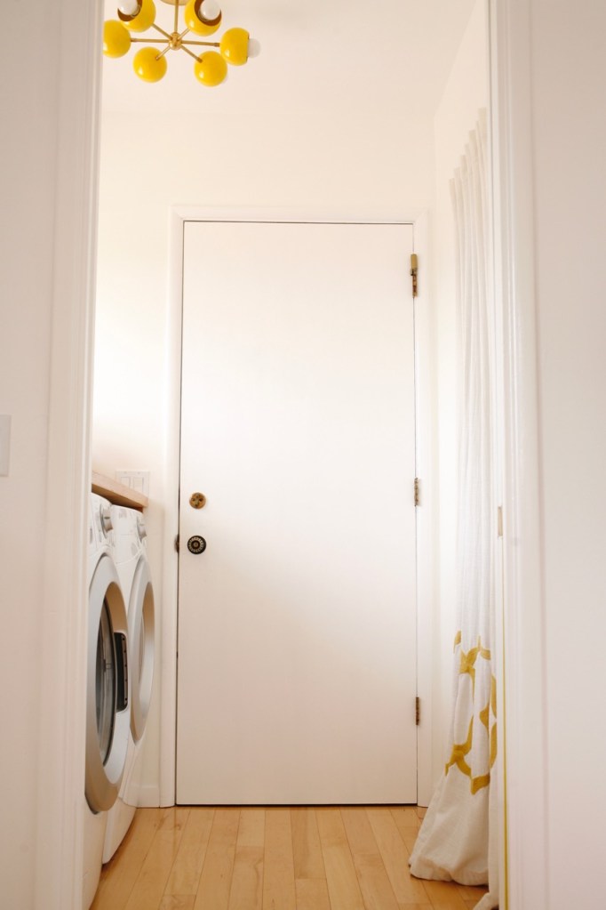 We finally finally finally bought the light I’ve been dreaming of for the laundry room – this wild, punchy yellow starburst from Sazerac Stitches. The laundry room (a generous title for what is actually a little alcove between the kitchen and the garage) doesn’t often make it to the top of the priority list in materials or projects, but I regret not making this simple but impactful swap much sooner!!
