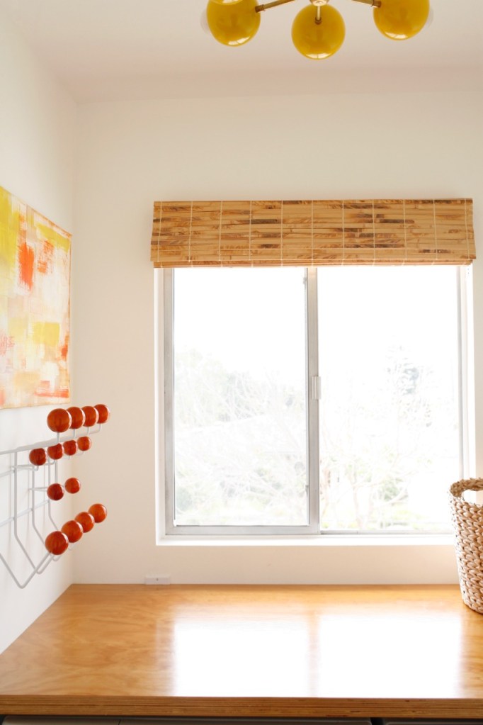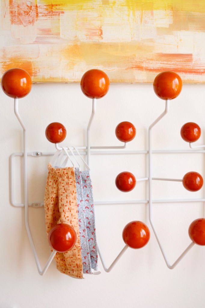 I put a wall hook on the inside wall (hidden from the kitchen yay!) to hang random stuff that one might occasionally need hung in a laundry room. I really want to paint the balls yellow, but is that too much yellow balls for one tiny room?? Right now, it’s serving as mask HQ.