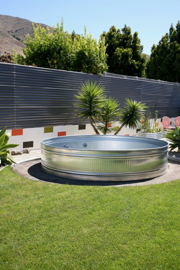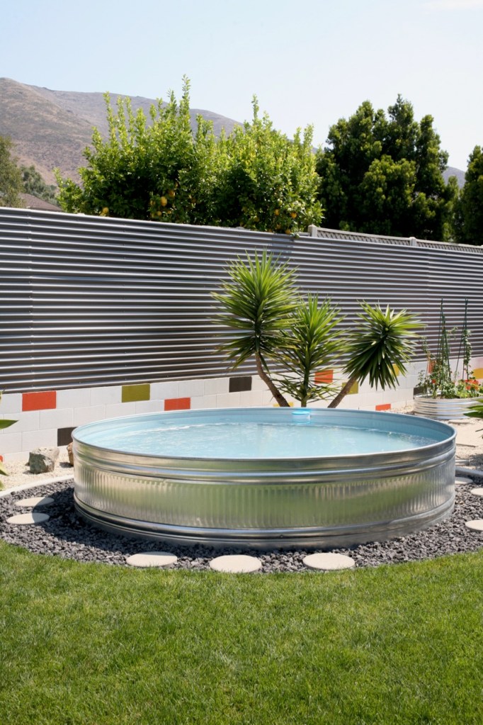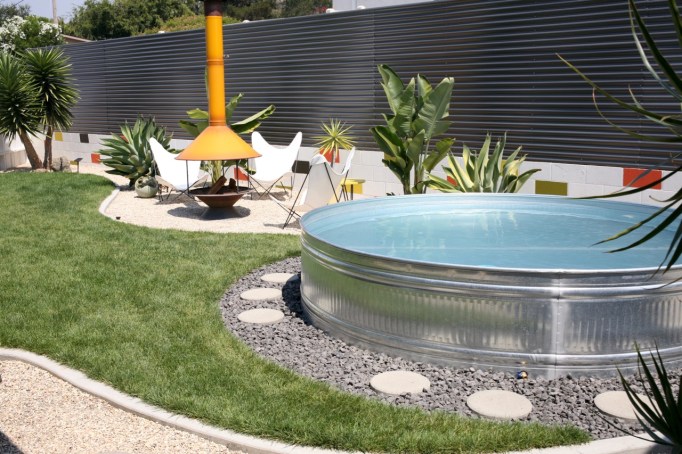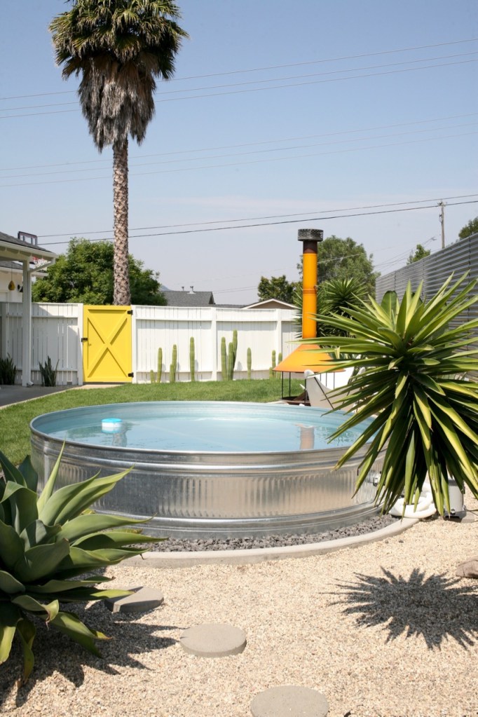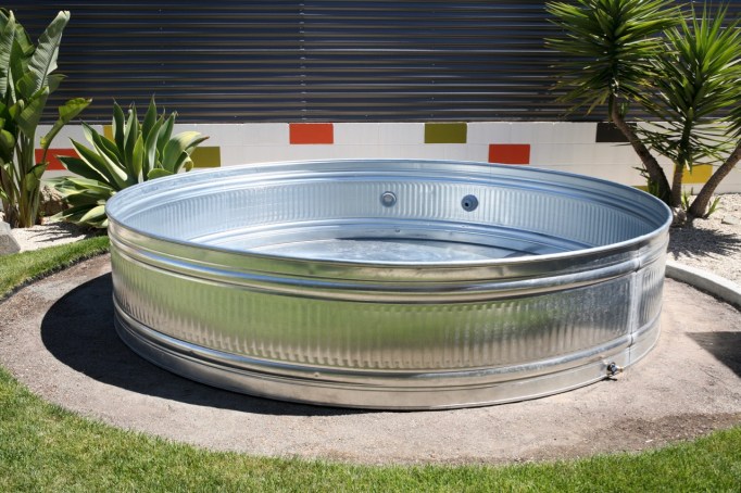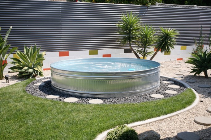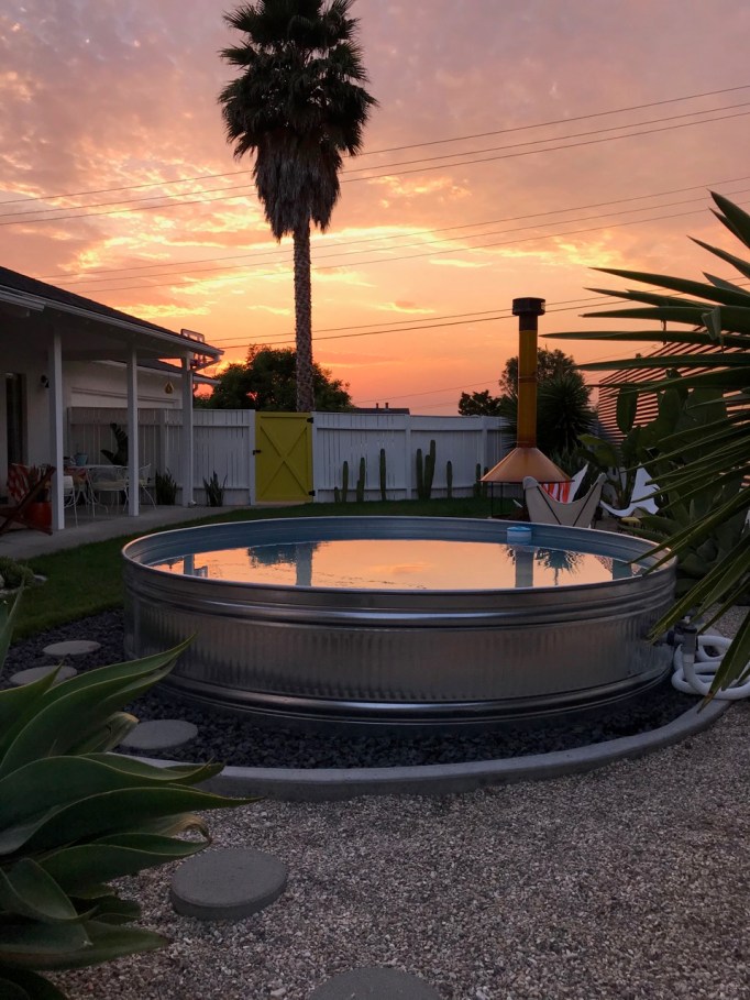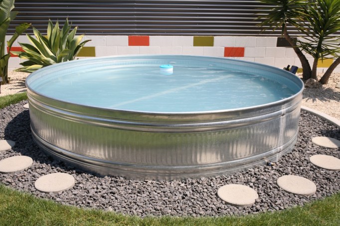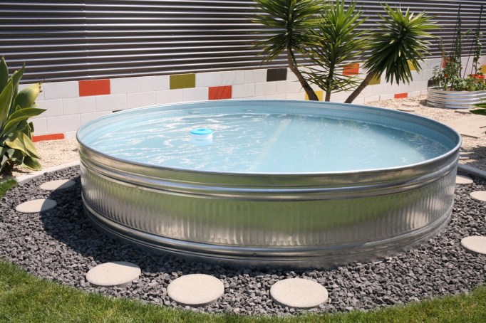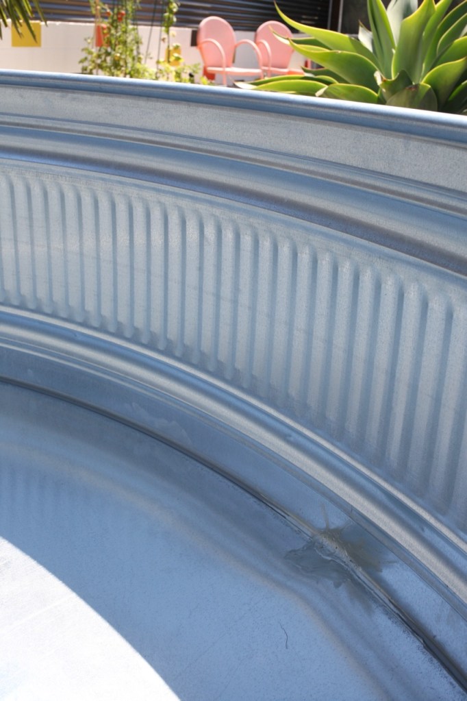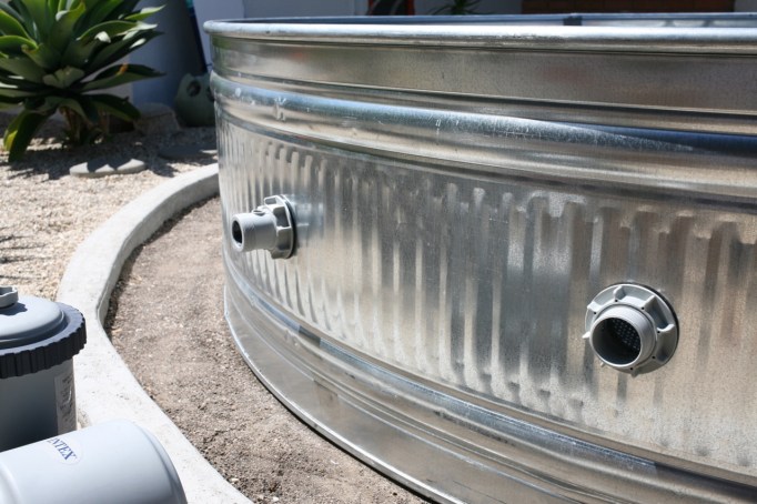 While there are many adorable painted stock tanks on Pinterest, a deeper dive will find that most painted ones have problems, and I haven’t found one example of a pool with a painted or sealed interior that went well. We have decided, at least for now, to stick with the raw metal both inside and out. But that aesthetic really works with our yard, so I understand the temptation to paint if galvanized corrugated metal looks dumpy in your space. If you do decided to paint, ONLY PAINT THE OUTSIDE and expect to repaint yearly. We’re hoping to get several non rusty years out of this thing but might go with a fabric liner like this if things get bad.