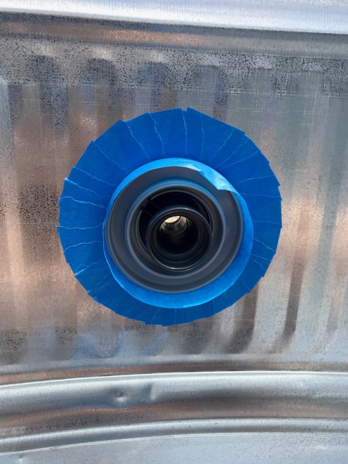 - Attach the inlet/outlet fittings with sealant or caulk. It’s best to tape the area off to avoid a mess. Don’t use too much or it will ooze everywhere. FYI we put sealant on the inside wall and the rubber gaskets on the outside wall and struggled to keep them in gaskets in place as we tightened. They were fine during a dry fits, but twisted when sealant was involved. I blame the corrugation. Patience and pushing them back into place got it done and everything is water tight.