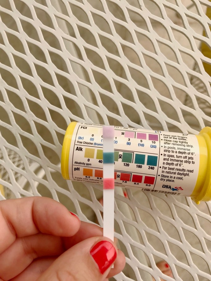 - Test the water and adjust chemicals as needed. So far, this has consisted of opening or closing the vents of the chlorine float depending on our chlorine levels, which should be between 1.0 – 3.0 ppm. Heavy use and heat seem to lower our chlorine levels, so I open our float to 3-4 vents on busy, hot days. Otherwise, 2 vent holes is good. It’s possible that you may need to add PH up or PH down chemicals if indicated on your test strips, because if the water’s PH is off, chlorine can’t properly be utilized. But so far so good for us.