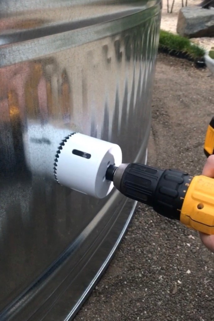 - Drill holes. Using a 2 3/4″ hole saw firmly push through the metal to cut out holes for pump connections. (And vacuum the metal shards out of the pool.)