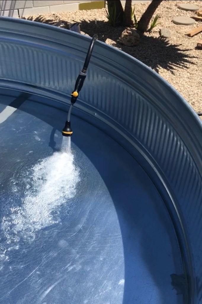 stock tank – come in a variety of sizes, all 2′ deep. 6′ or 8′ can usually be found at Tractor Supply but we special ordered a 10′ Behlen stock tank (1100 gallons) through a local chain on CA’s Central Coast, Farm Supply (2021 UPDATE: I’ve seen some in stock recently at our local location). It took several months for manufacturing and delivery from Oregon. I highly recommend a 10′ over a 8′ if you can find one. For reference, our 10′ stock tank was $530 + tax + $60 delivery + tip to carry it into our yard.