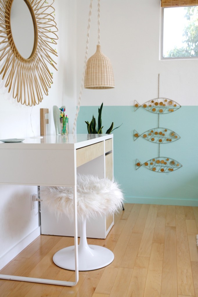 My kiddo was over the pink and wanting a change so we considered a few different options to bring a different color into the room. This wallpaper was a contender but they weren’t 100% committed, so no wallpaper until then! They still really liked the partial wrap around color so we took the easy path and simply repainted it for now. We did a few sloppy mock ups of ideas (the drawing tool in IG stories is my go-to for quick brainstorms) and they decided on a minty turquoise. We went a shade lighter than the final color we were going for because once a color is on the wall, especially surrounded by white, the saturation is so much more intense than it appears on a tiny swatch. The winner was Behr Free Spirit – the color Palm Springs pool water :)