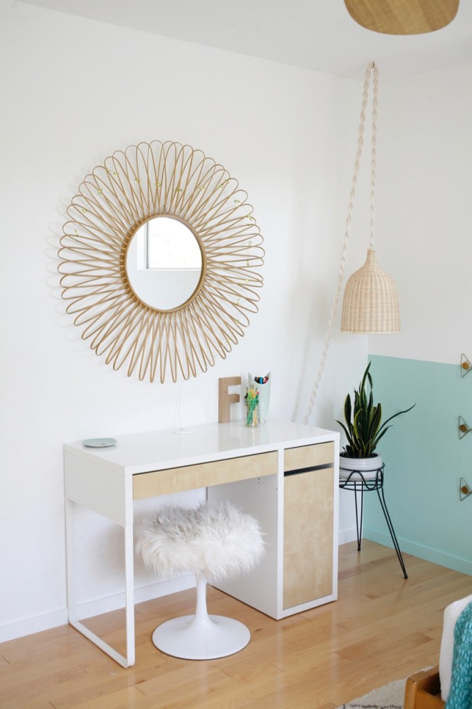 This summer we also hastily threw together a desk space for indefinite virtual learning. Desk was found for free on craigslist, and though it needed a bit of work, it was the exact one we had planned to buy from Ikea when it was possible to get to/shop at Ikea again. Score. Everything else we had on hand. The mirror and stool were plundered from our room, and I covered the seat in faux fur. The hanging lamp has been floating around the house for years (originally from Ikea too; I added the macrame cord). All in all, not a bad update for $15 worth of paint!