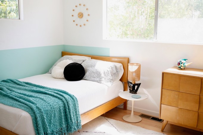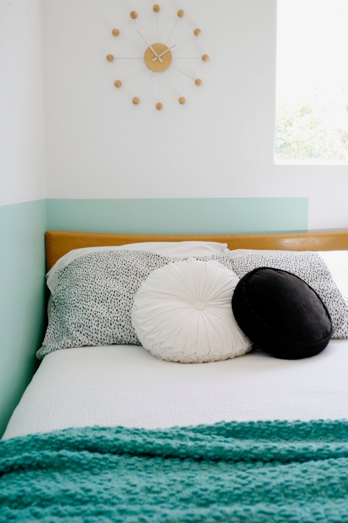 We extended the color-blocked section slightly further behind the headboard, but otherwise we kept the same footprint. I taped as close as I could to the original line and did the crisp line trick where you seal the tape line with the other paint color (white), let that dry, then paint the actual color (turquoise). We tackled this project right after stay-at-home orders in March so we had to improvise with supplies…all I had on hand was a tiny 4″ paint roller ha!