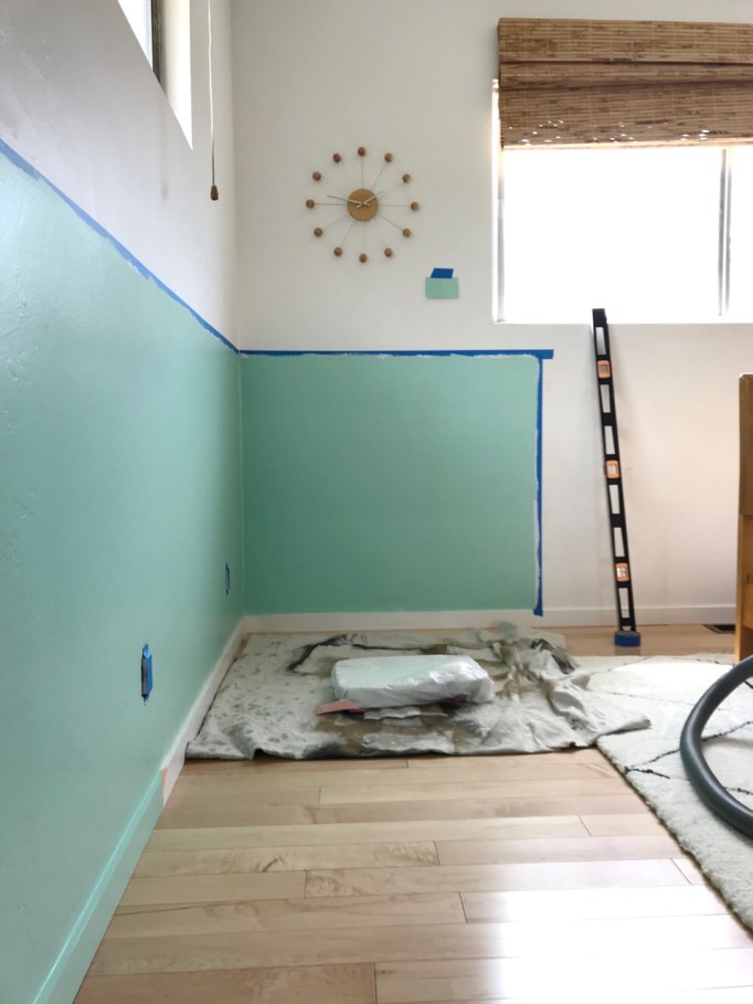 My kiddo was over the pink and wanting a change so we considered a few different options to bring a different color into the room. This wallpaper was a contender but they weren’t 100% committed, so no wallpaper until then! They still really liked the partial wrap around color so we took the easy path and simply repainted it for now. We did a few sloppy mock ups of ideas (the drawing tool in IG stories is my go-to for quick brainstorms) and they decided on a minty turquoise. We went a shade lighter than the final color we were going for because once a color is on the wall, especially surrounded by white, the saturation is so much more intense than it appears on a tiny swatch. The winner was Behr Free Spirit – the color Palm Springs pool water :)