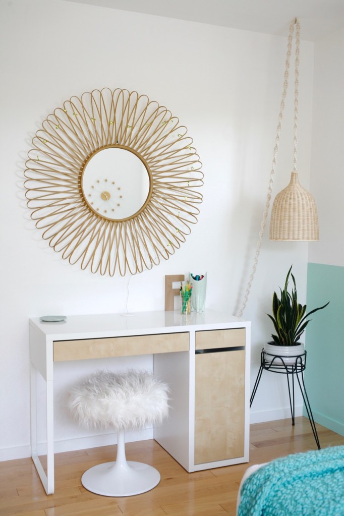 This summer we also hastily threw together a desk space for indefinite virtual learning. Desk was found for free on craigslist, and though it needed a bit of work, it was the exact one we had planned to buy from Ikea when it was possible to get to/shop at Ikea again. Score. Everything else we had on hand. The mirror and stool were plundered from our room, and I covered the seat in faux fur. The hanging lamp has been floating around the house for years (originally from Ikea too; I added the macrame cord). All in all, not a bad update for $15 worth of paint!