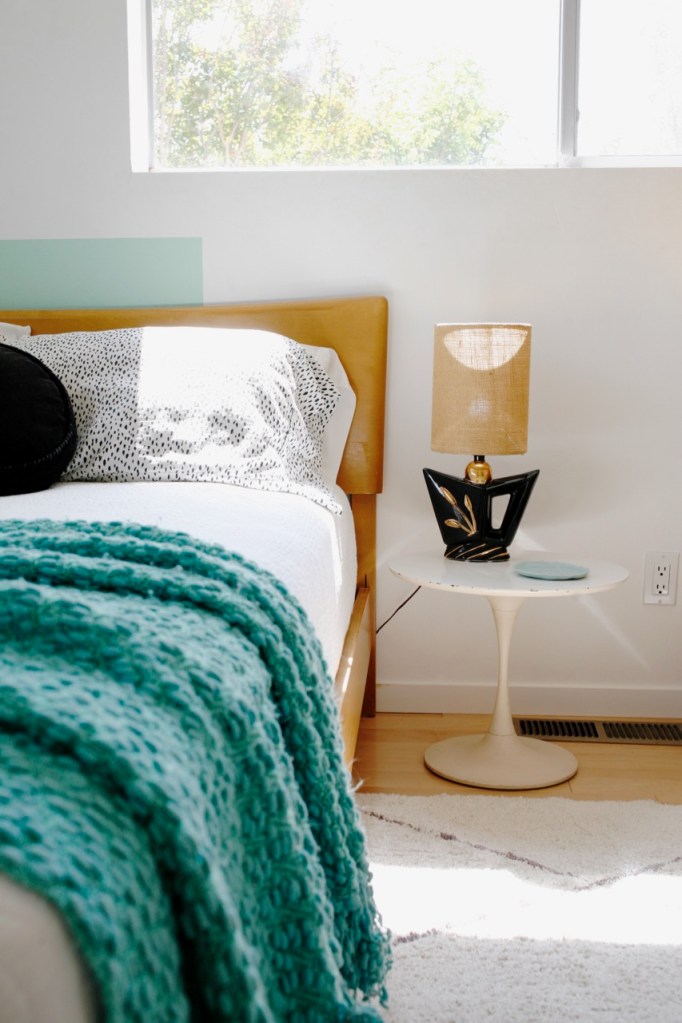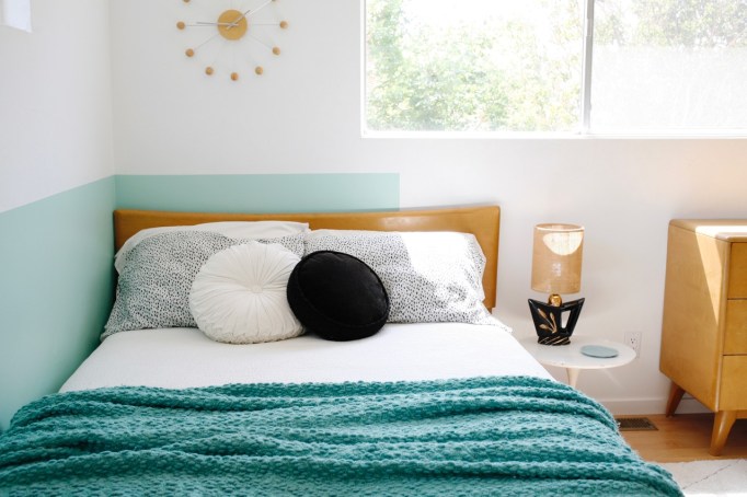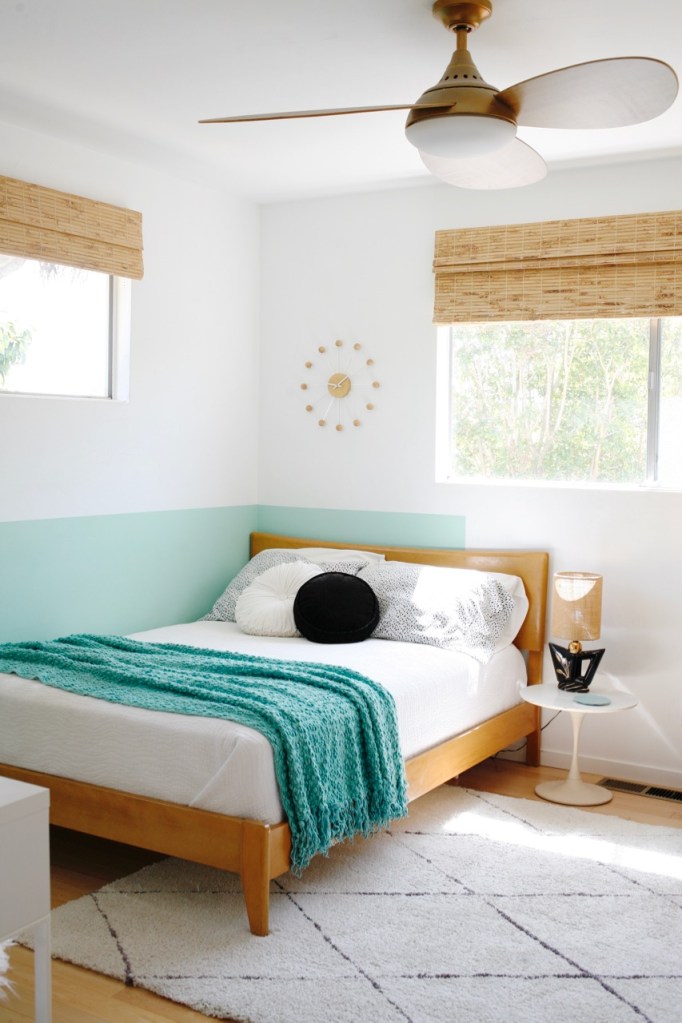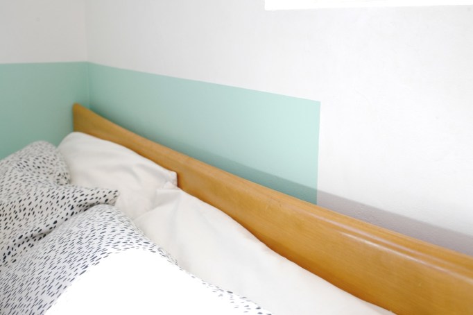We extended the color-blocked section slightly further behind the headboard, but otherwise we kept the same footprint. I taped as close as I could to the original line and did the crisp line trick where you seal the tape line with the other paint color (white), let that dry, then paint the actual color (turquoise). We tackled this project right after stay-at-home orders in March so we had to improvise with supplies…all I had on hand was a tiny 4″ paint roller ha!