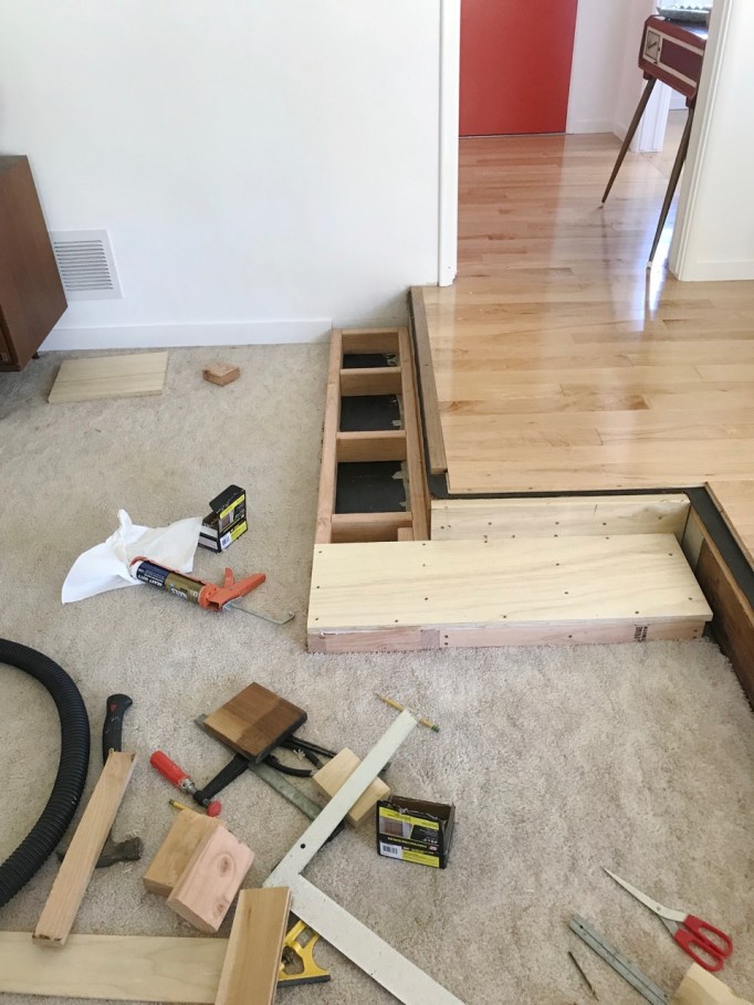 Step down: For the step down area we decided to add a shallow step to bridge the 8″ drop and make the entrance to the room feel more intentional. Figuring out comfortable stair measurements was a pain but we did it! My husband did an impressive job making a new step and top nose to perfectly match our maple floors.