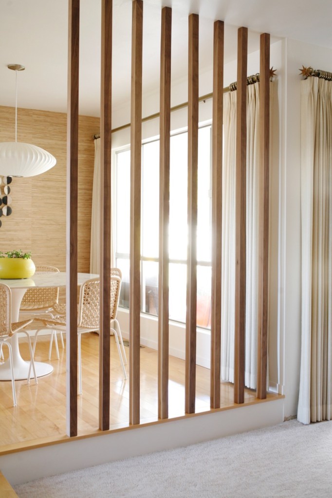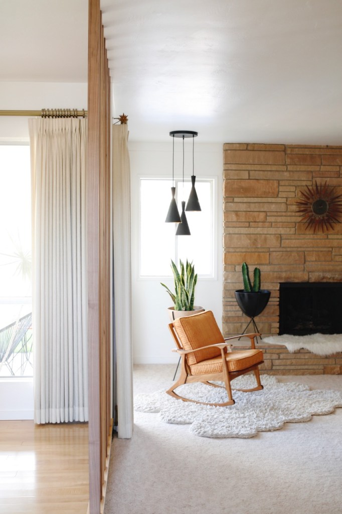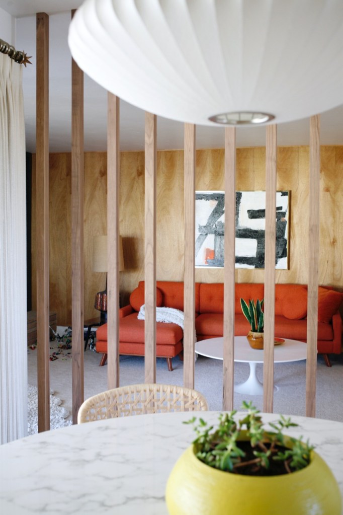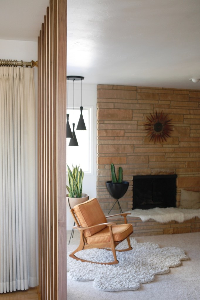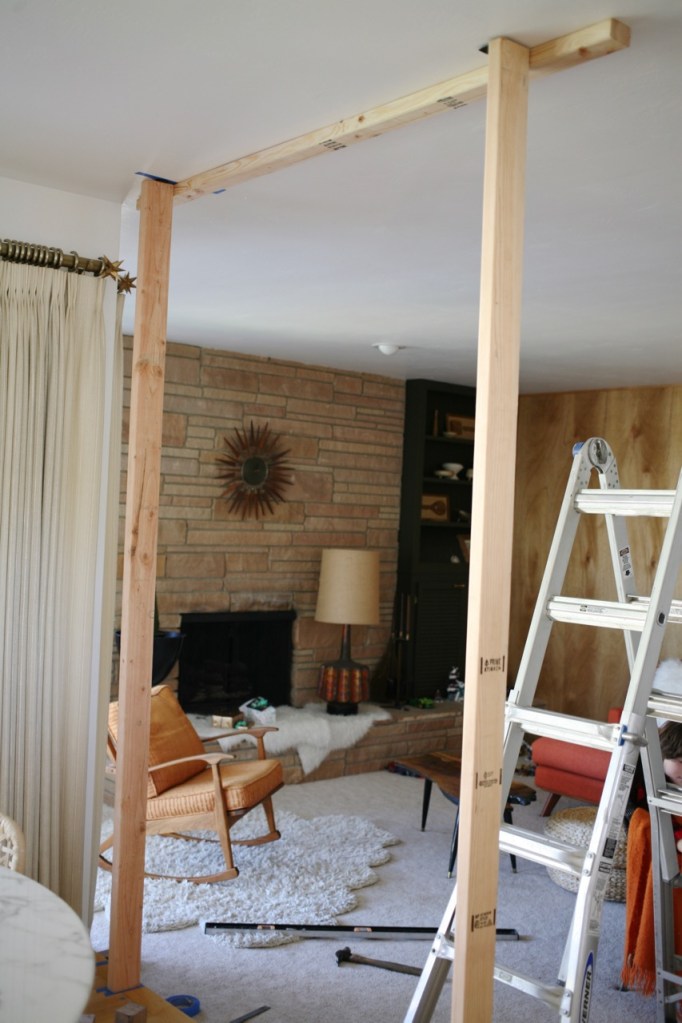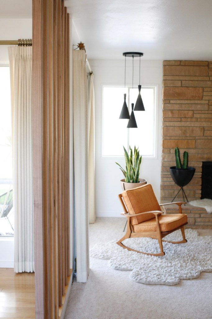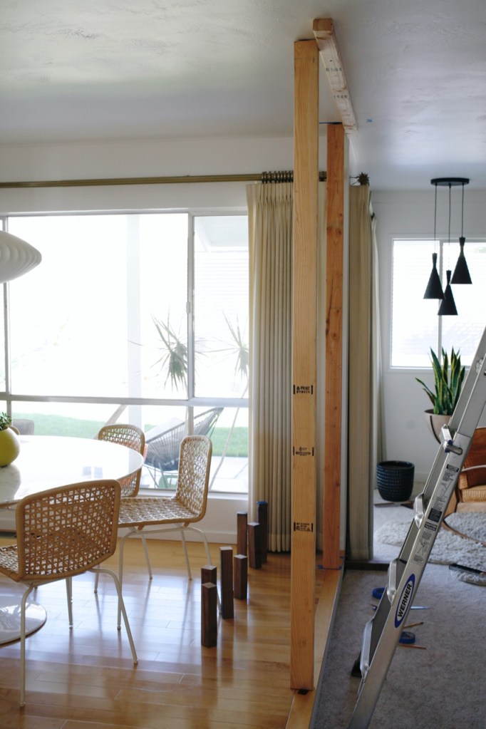 Where we began: Normally I’m all for preserving original details, but I didn’t love the ornate 60’s iron rail that divided these two rooms. And the step down into our sunken family room had an awkwardly large drop we wanted to fix, so we made a plan to rework the whole area incorporating a wood floor-to-ceiling room divider. After removing carpet and installing wood floors, we lived in a very unfinished state for longer than I care to admit…