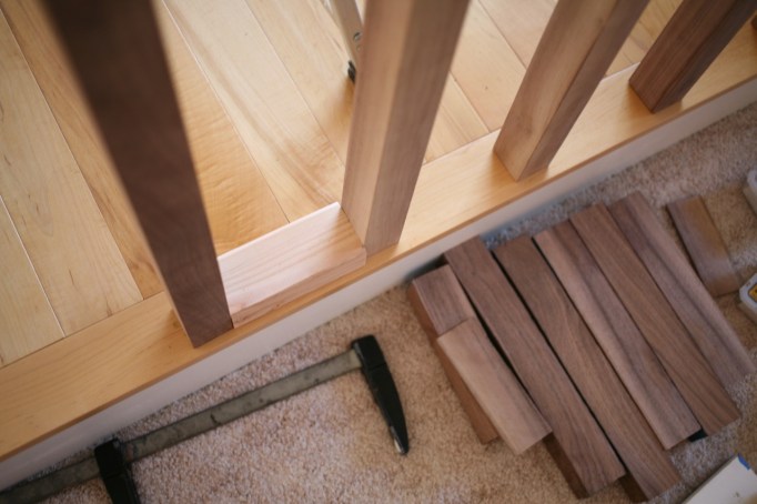 Divider construction: We put up a temporary guide board on the ceiling and used wood spacers and clamps to get the divider slats perfectly placed. The wood is screwed directly into the floor and ceiling with trim screws: we use these 2″ screws for the floors, and these 3 1/8″ screws to reach through the drywall and into the header that was thankfully right where we needed it to be in the ceiling. It is extremely important to drill pilot holes into the wood before screwing them in place! For reference, our walnut slats are 1 3/4″ x 1 7/8″ and are spaced 5 3/4″ apart. So many people have asked if this is sturdy enough to handle a household with rambunctious dogs and children and the answer is yes! While I think Chris Farley could smash his way through the divider if he wanted to, these are surprisingly strong with very little flex. I doubt any normal kid/pet rough housing could budge them.