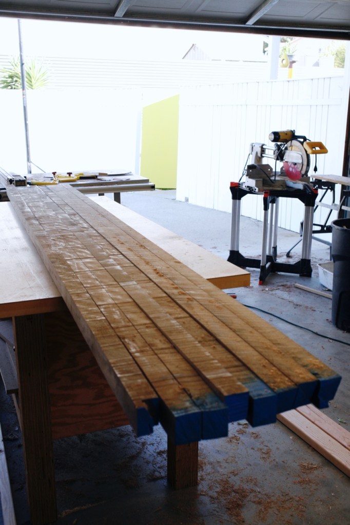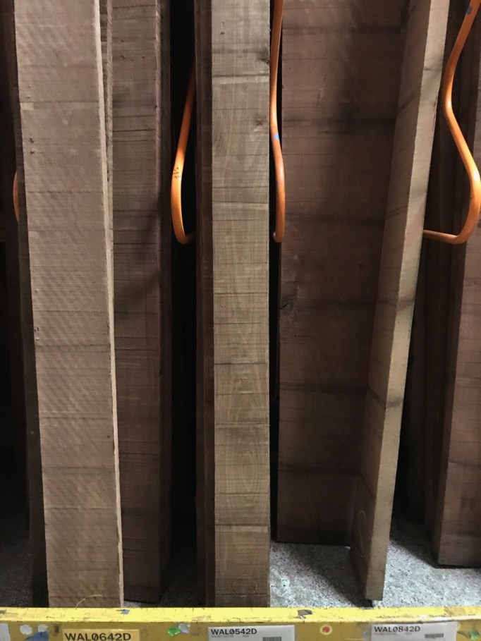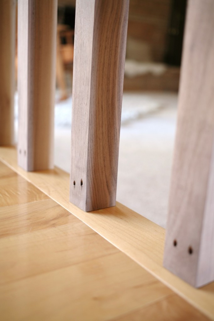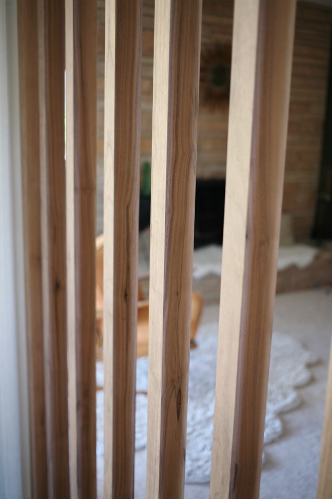 Divider wood: The next step was the actual room divider, which again we had the time to debate for literal years. Walnut or redwood? Simple slats or funky design like the front screens? After we did the wood wall in the family room, the most important element became coordinating well with that wood and the rock on the fireplace. We thought walnut was the best choice, but it’s expensive. To save money we dug through a pallet of 8/4 rough sawn common walnut to find straight boards with minimal knots, which is substantially cheaper but required a lot of cutting and surfacing at home. My husband somehow milled 8 (semi)straight posts from 3 boards using only a table saw. It took days but we only spent $175 on the walnut – a very reasonable price, especially right now!