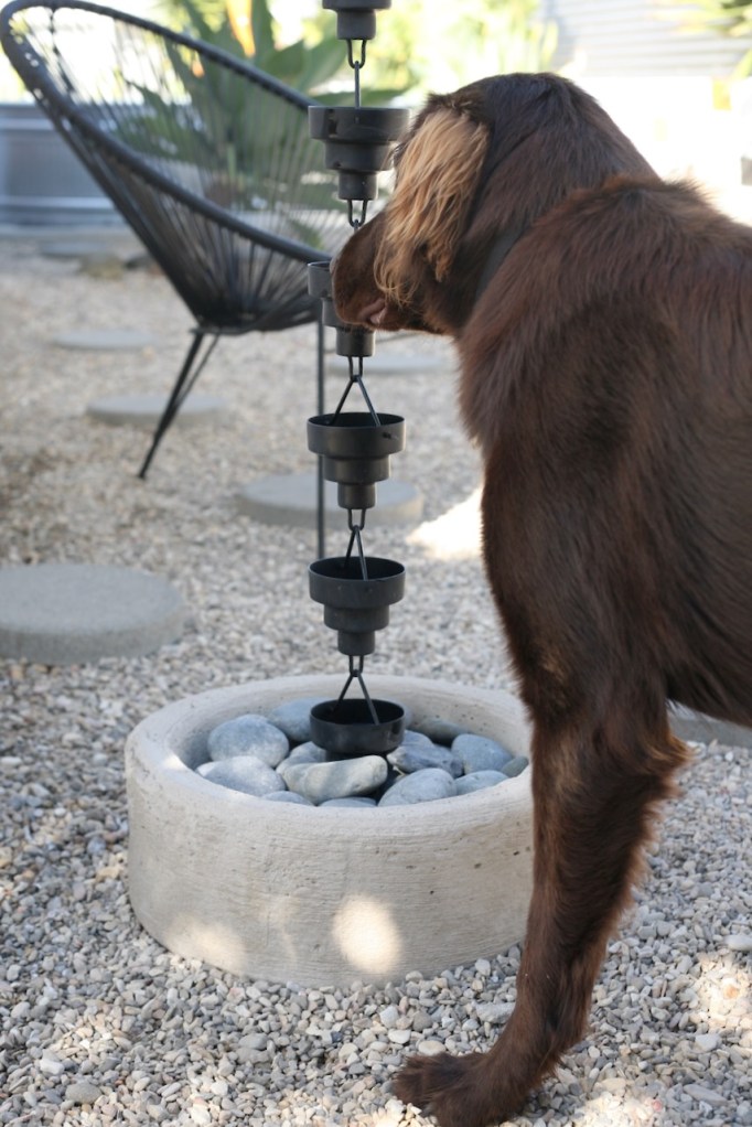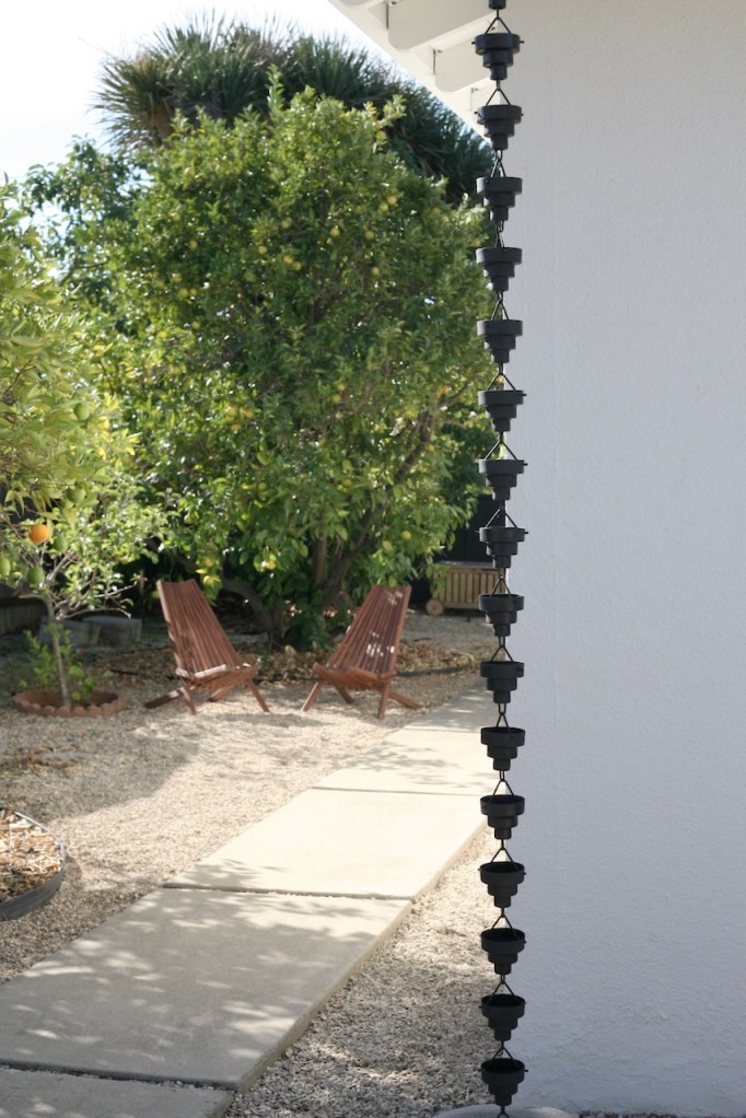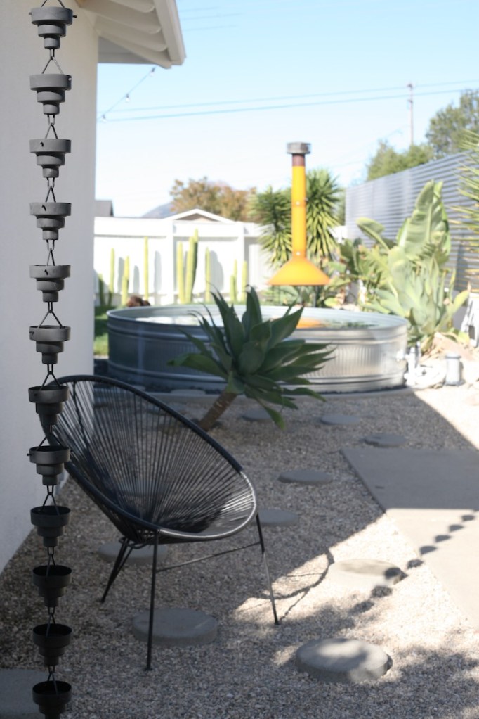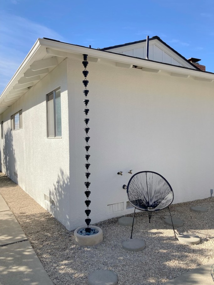 When we were replacing the underground gutter drainage pipes in our backyard, we swapped out an old rain gutter for a rain chain. We rigged it up ourselves and weren’t sure how much water a chain could direct vs an enclosed gutter pipe. Turns out, they can handle A LOT of water, even doing the job during the intense flooding that California saw last month. We are now two rain seasons in and couldn’t be happier with the change. It looks so much better than the crappy gutter that it replaced and even sounds pretty. It’s been such a success that we are hoping to eventually move to rain chains in the front yard too.