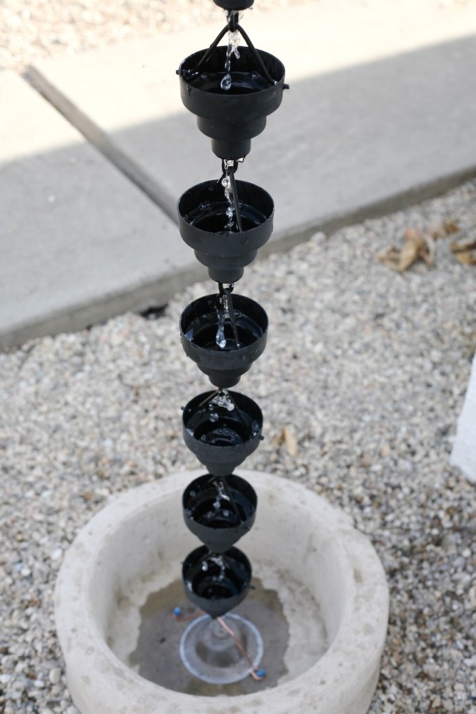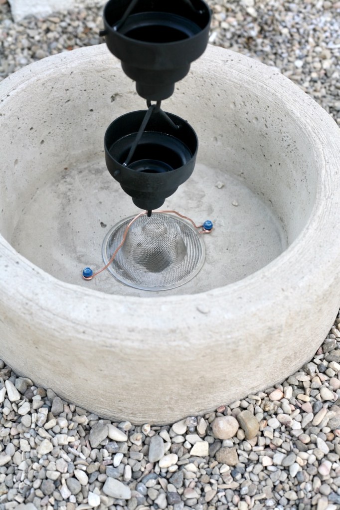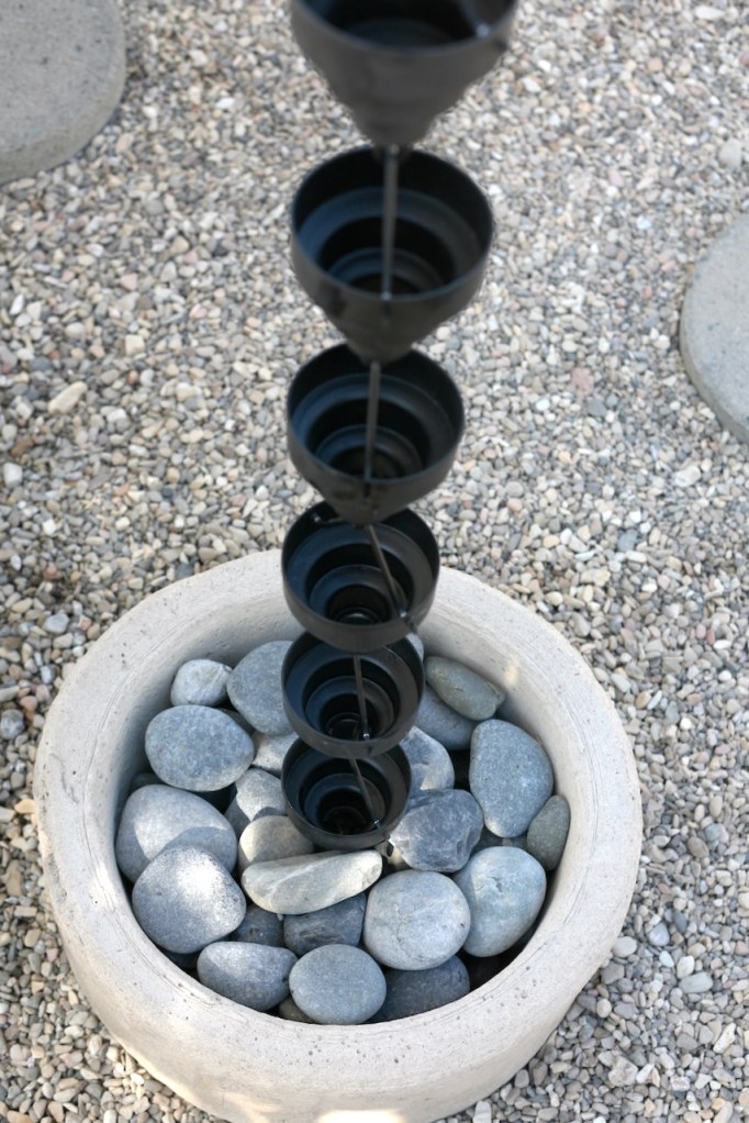 For the basin, we originally purchased this 15″ hammered rain chain bowl, which I totally recommend if it fits your space, but the scale was off for this open area so we made our own.
