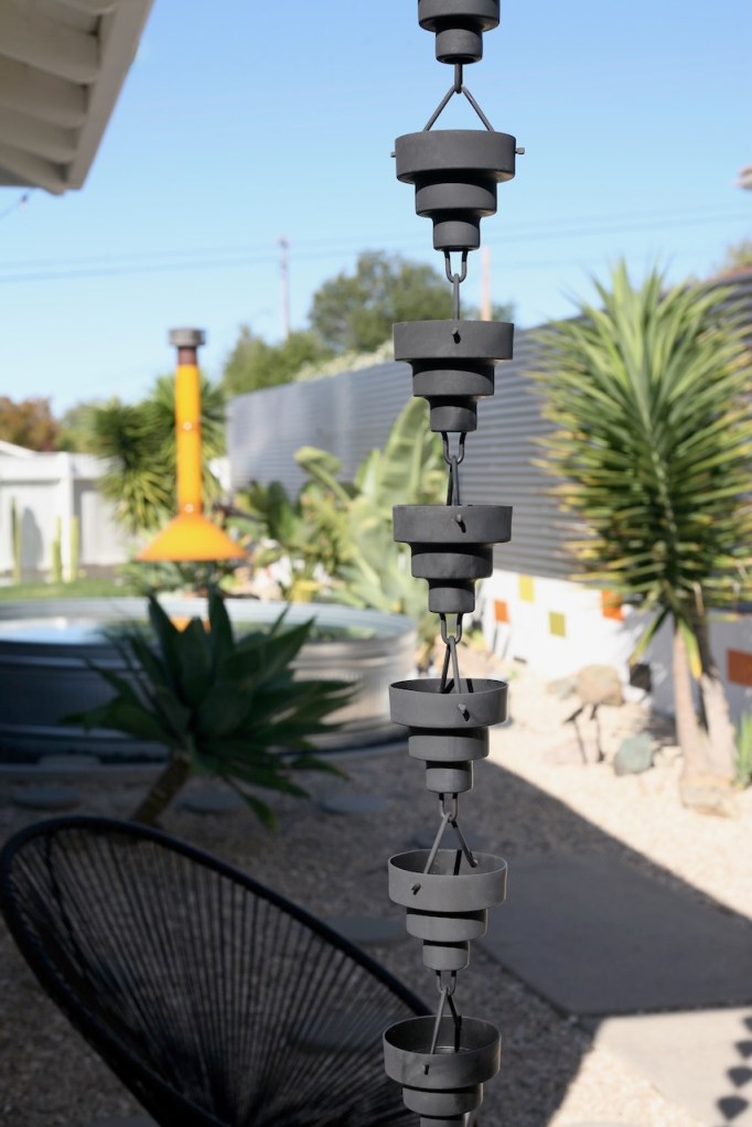 For the chain itself, we bought this kooky devo hat rain chain, which would probably fit right in in a craftsman or Usonian home but I think works for our 60’s ranch too, along with this gutter adapter. Other cool chains we considered: cylinders, squares, stacked cubes.